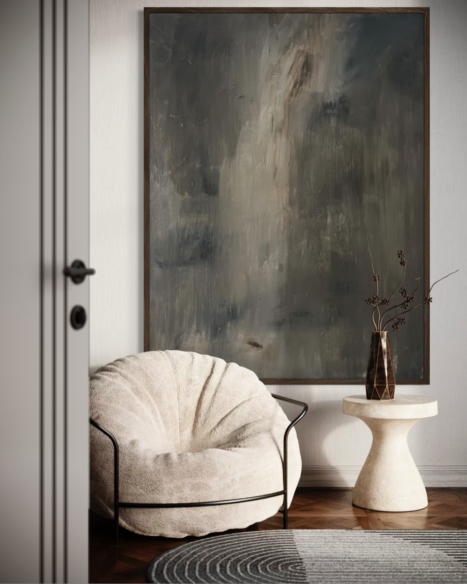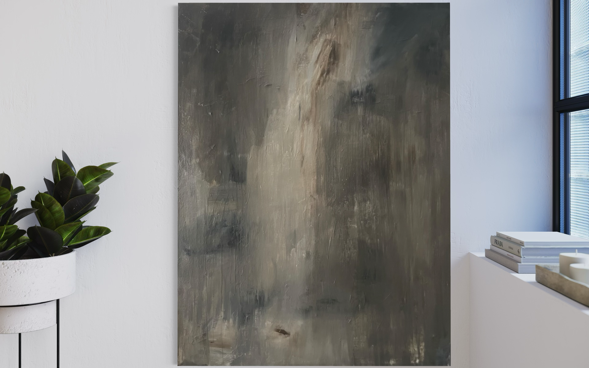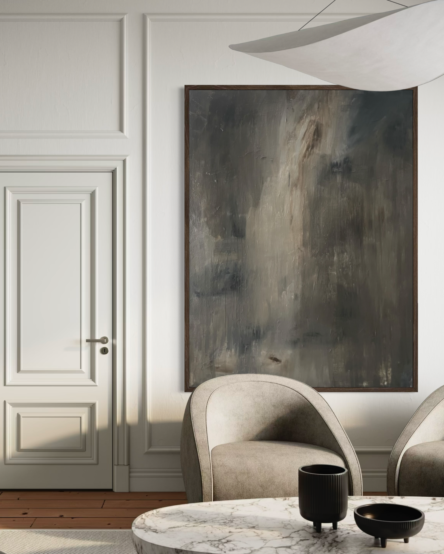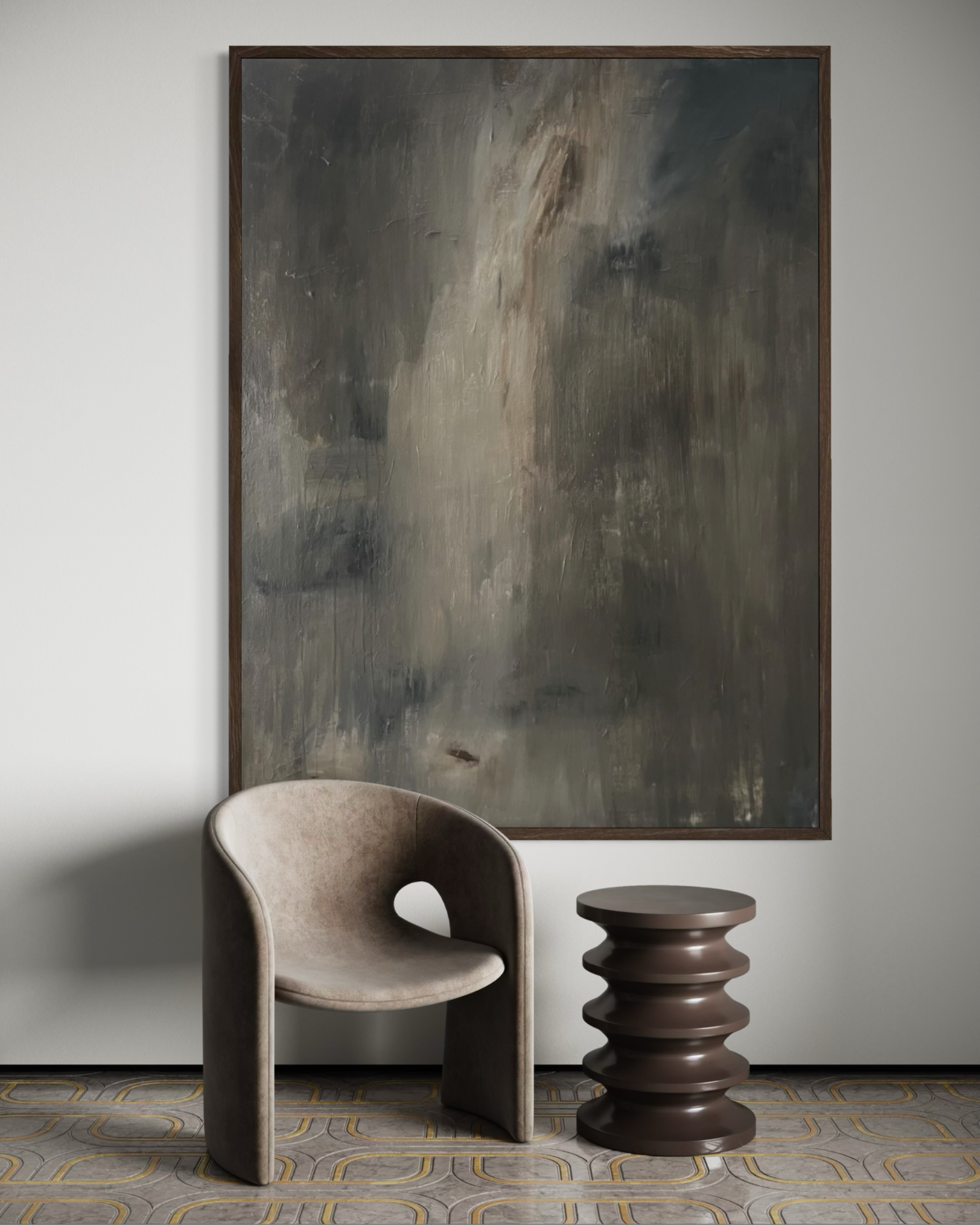 Abstrakt maleri i mørke nuancer - brun, grå og beige. Moderne vægkunst